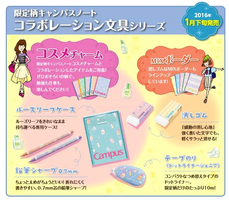Campus美妝系列限定商品:筆記本,活頁紙資料夾,好黏便利貼,自動鉛筆